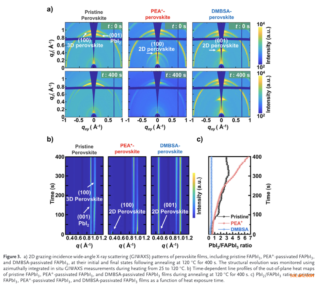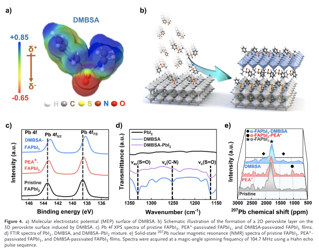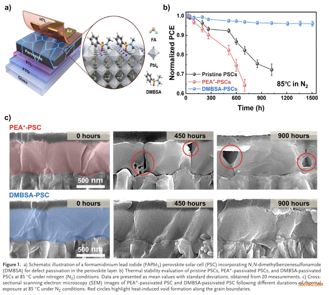在这里,N、N-二甲基苯磺酰胺(DMBSA)是一种通过简单工艺合成的非离子二元化合物,被用作缺陷钝化材料。与 PEA +不同,DMBSA 由于强共价键而保持热稳定性,并且在高温下不会发生去质子化。此外,其较低的亲核性可防止与 FA +发生不良反应,从而显着减轻钙钛矿降解。因此,在 85 °C 下热应力 1500 小时后,DMBSA 钝化的 PSCs 保持了 96.1%±0.8%的初始光转换效率(PCE),而 PEA+钝化 PSCs 仅为 64.0%±0.19%。
