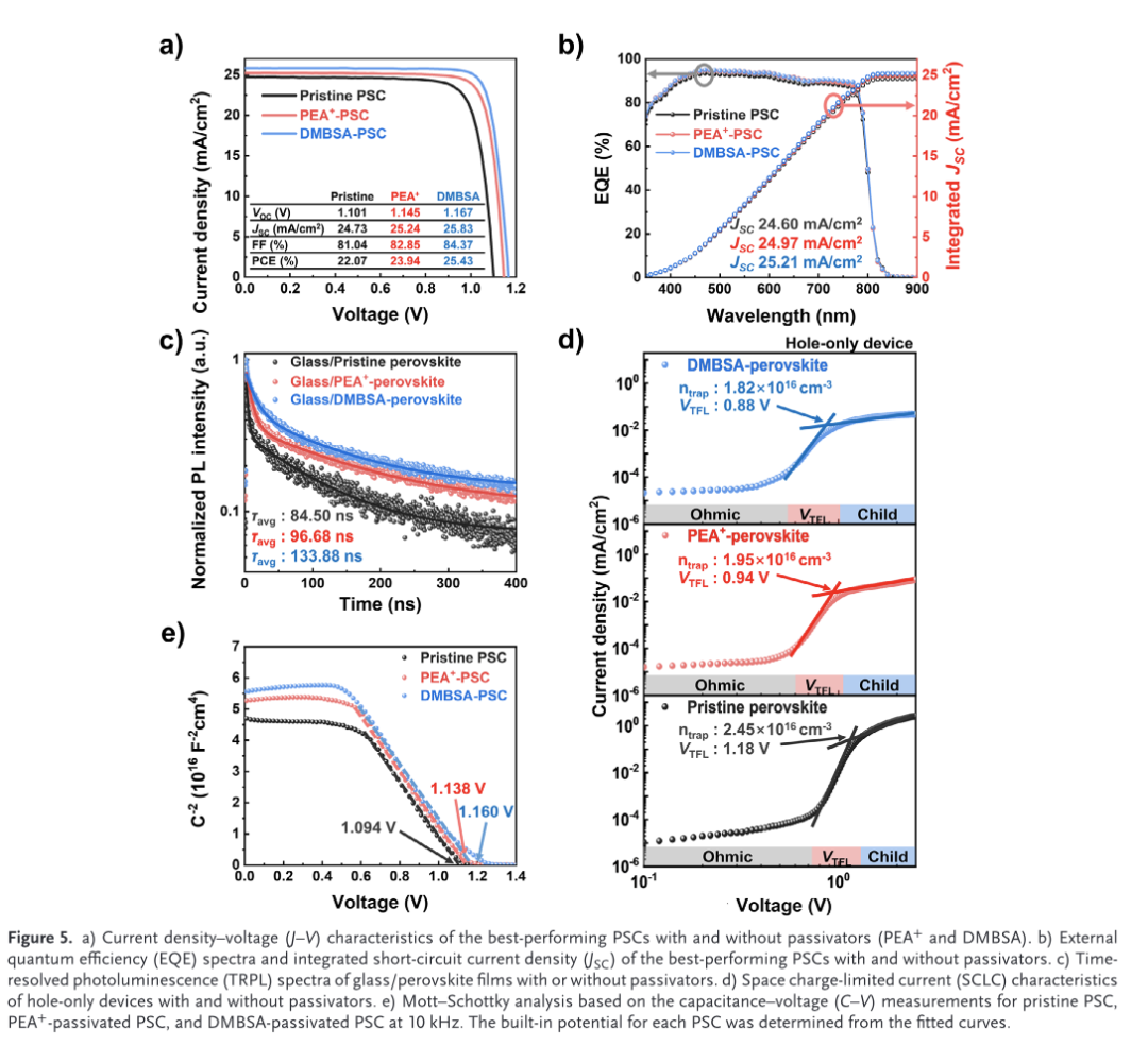 此外,DMBSA 钝化有效地抑制了非辐射复合,而其偶极矩感应出电场,促进了空穴向空穴传输层的高效转移。因此,DMBSA 钝化的 PSC 的 PCE 为 25.43%(认证 25.1%),大大优于原始 PSC (22.07%)。