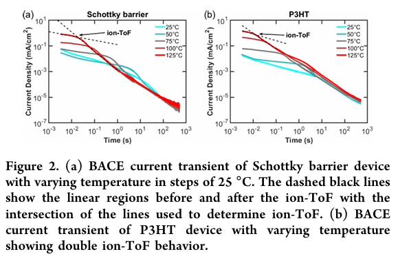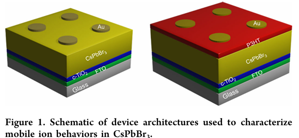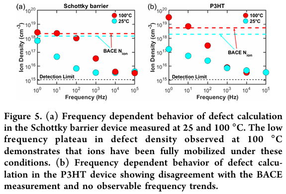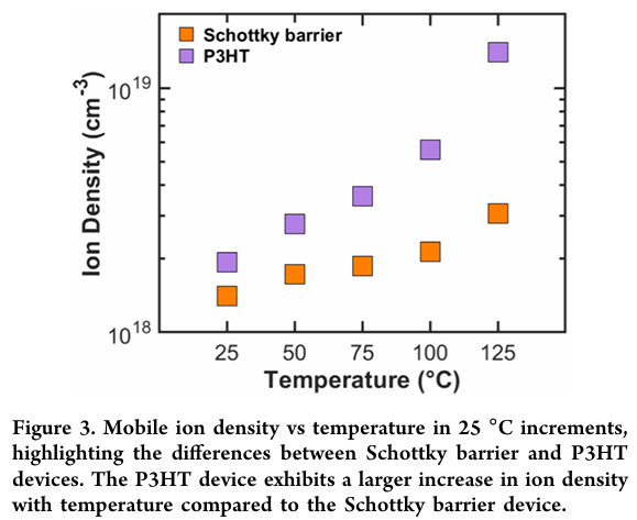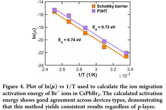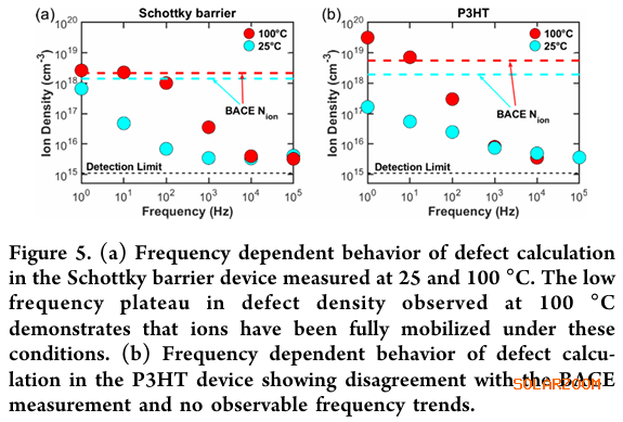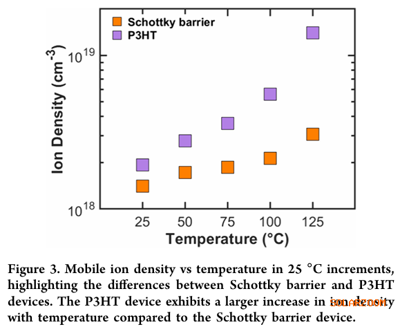 本研究爱荷华州立大学Vikram Dalal等人通过25-125℃温域下的BACE与Mott-Schottky测试,系统分析了含/不含有机p层的CsPbBr₃器件中离子密度、迁移率及电子缺陷特征。研究指出,仅当离子响应完全激活时,两种方法才能可靠估计移动离子密度。温度升高通过提升离子迁移率激活离子响应,使离子参数可量化。BACE测量显示离子迁移率与浓度随温度升高而增加,并可通过离子飞行时间计算Br⁻激活能;Mott-Schottky测试则呈现高频电子缺陷平台与低频离子缺陷平台。特别发现有机空穴传输层会导致测量误差及更大的移动离子浓度,而无机结构器件则无此现象。